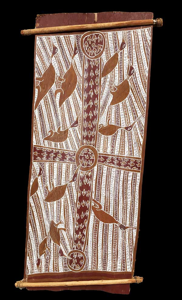|  Unknown | YirrkalaJap 023220 | ochre pigments on bark | 115 x 54 cm
