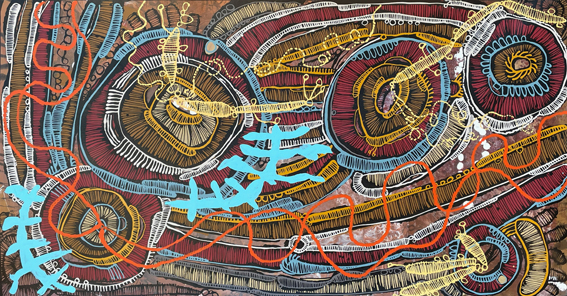 An important aspect of Jackie’s work is the narrative of the female experience and the role of women’s contributions to local indigenous communities. In the colourful Walking on Country series, sites of gatherings around shallow water pools at Lake Tyrrell are overlaid with images of dilly bags, referencing the traditional craft of weaving, as well as women’s central role in nurture and food preparation.