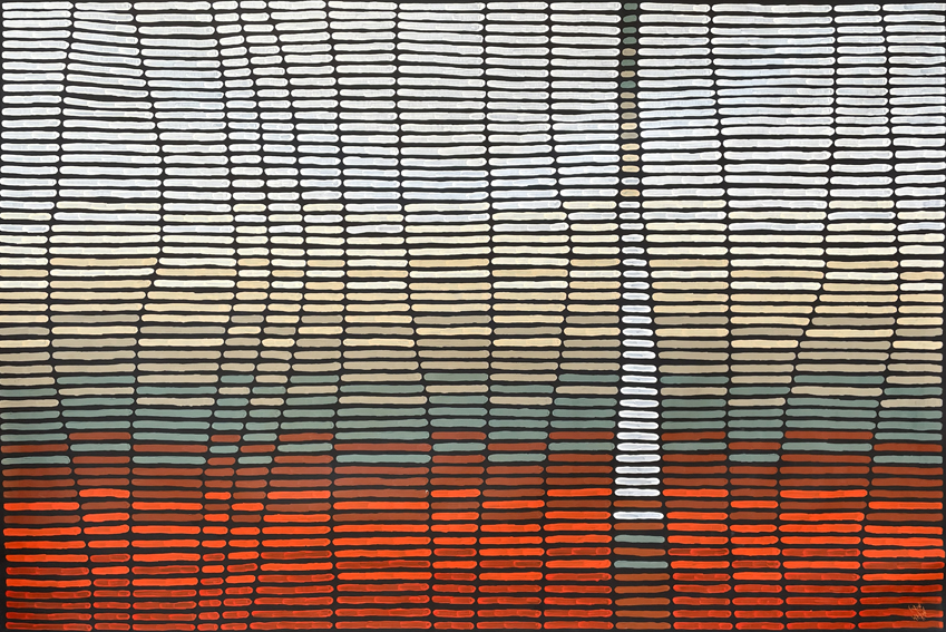 Kurun Warun’s use of colour reflects the primary resources of indigenous people – red, black and white are used to convey cultural body markings and structures found in nature. Kurun Warun first exhibited in 1974 in Melbourne alongside his mother, who had trained as an artist. When he returned to art as an adult he began exhibiting in 2000, with exhibitions in Noosa Regional Gallery, Parliament House in Brisbane, in South Korea and Sydney.