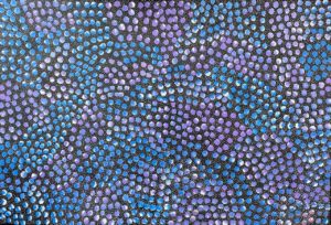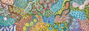 Salt Lakes are major landmarks of inland Australia, many are millions of years old, the remnants of ancient dried river plains. The vibrant colours from mineral deposits are seen in Janice Stanley’s artworks of Pantu salt lakes in South Australia, part of a larger Dreaming story of the Seven Sisters constellation. Jackie Wirramanda paints images of Lake Tyrell in north-western Victoria with aspects of her ancestral country where people gathered around the shallow water pools.